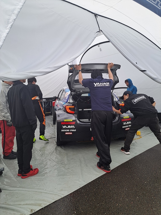競技当日は雨天となりましたが、環境変化に対応しながら整備と情報共有を行い、各サービスでは損傷対応やセッティング変更を含めた作業を着実に実施。走行後も事前の打ち合わせに基づきアライメント確認と状況整理を行い、翌日に備えました。